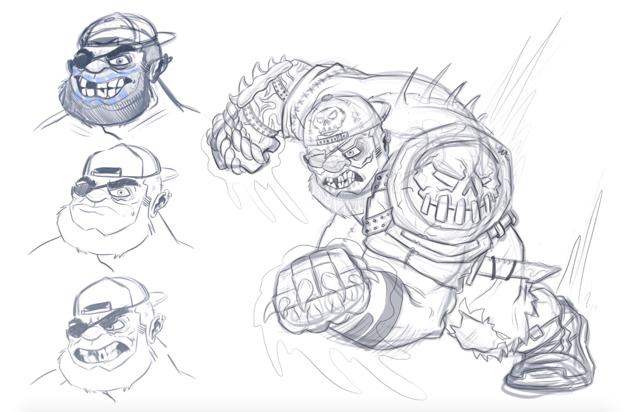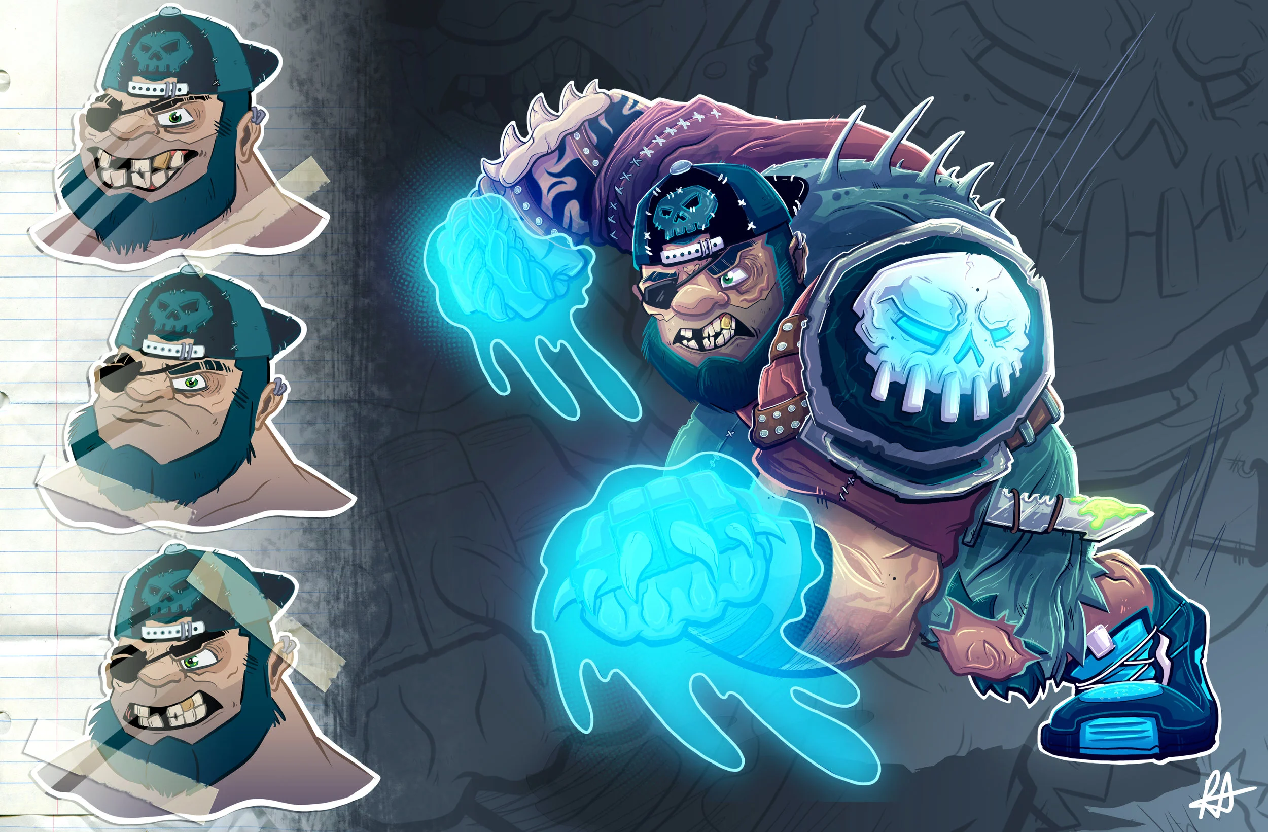 I'm not fully set on exactly what type of humans will inhabit this world, but I like the idea of having some sort of modern day scavenger/pirate type gang, so this is what I was going for when designing this character. I knew that I wanted him to be big an bulky, and I wanted to give the impression that he just went into everything full charge and he's basically a bit crazy, and people have good reason to be scared of him!